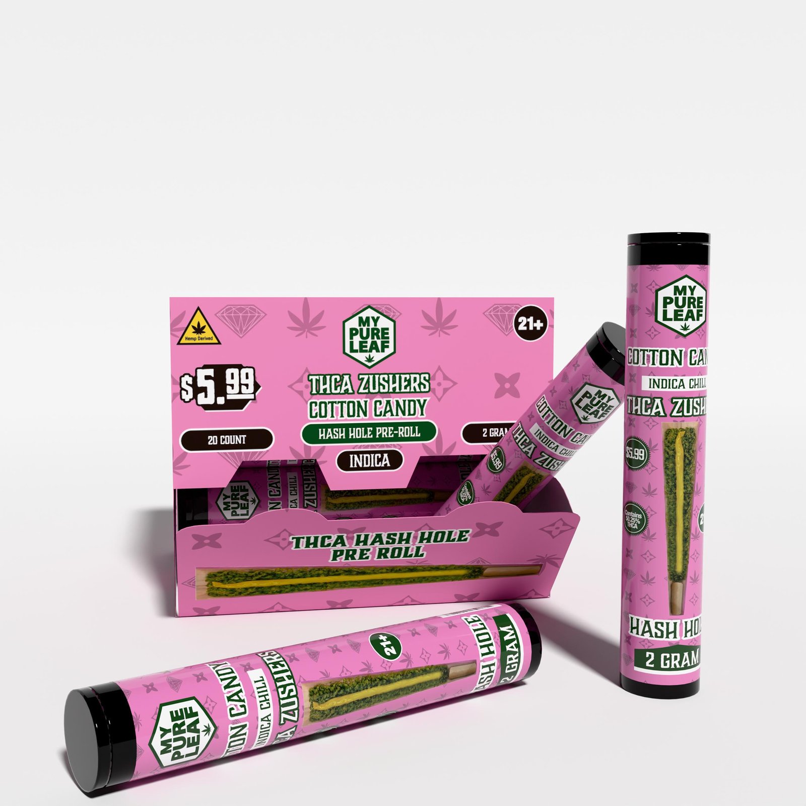 My Pure Leaf THCA Zushers Berry Blast Hash Hole Pre-Rolls deliver a potent hybrid experience packed with rich berry flavor and premium craftsmanship. Each 2-gram hash hole pre-roll is infused for maximum strength and smoothness, offered in a vibrant 20-count display perfect for retail shelves.