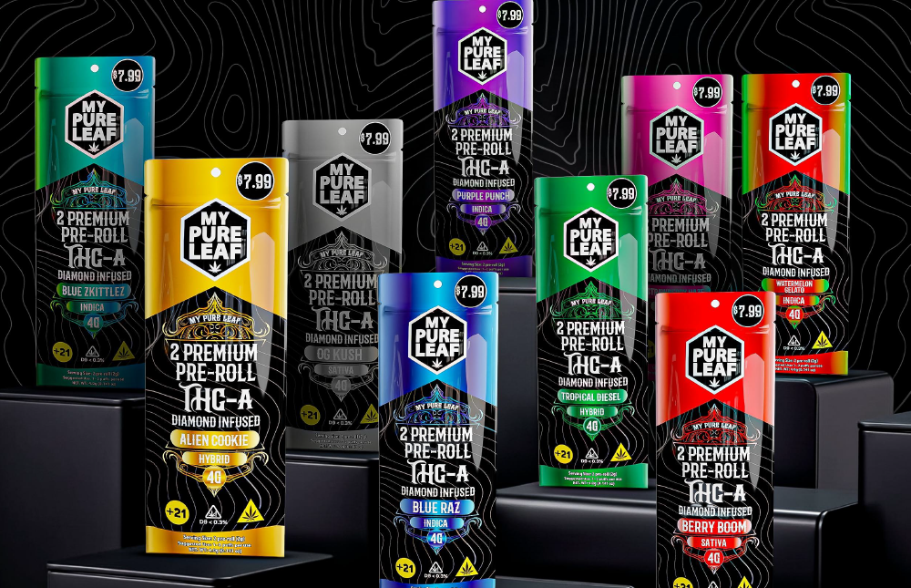 My Pure Leaf Blue Zkittlez THC-A Diamond-Infused Pre-Rolls offer a premium Indica experience with smooth flavor and powerful relaxation. Each display contains multiple 2-pack pouches, delivering 4g of high-quality, diamond-enhanced pre-rolls crafted for deep, calming effects.