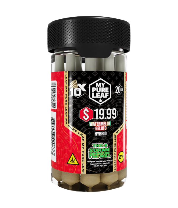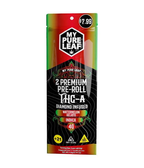 A premium jar containing 2-gram THC-A infused pre-rolls made with the hybrid strain Watermelon Gelato. The bold, vibrant packaging highlights its quality, offering a smooth, fruity, and potent smoking experience.